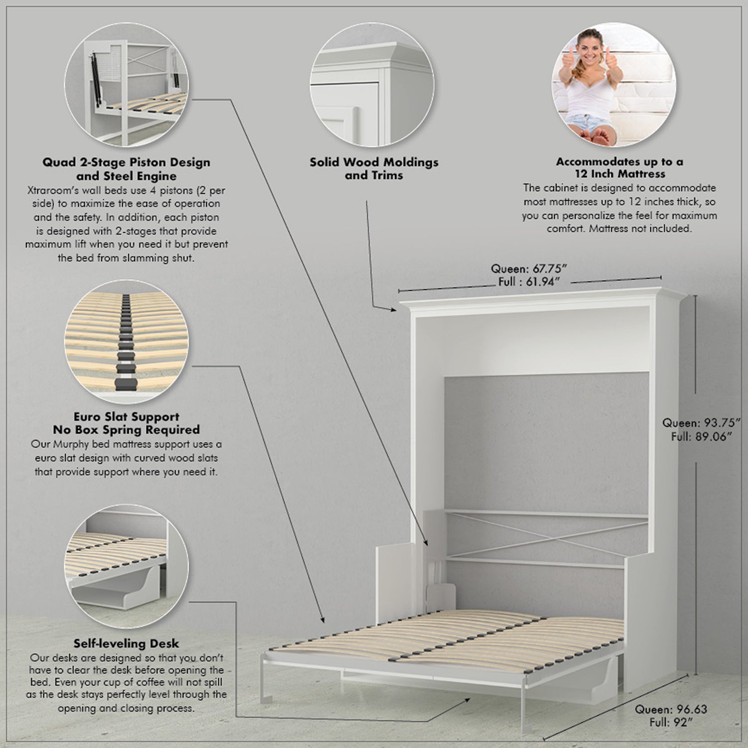 Accommodates most standard matresses up to 12" thick (bedding removed before closing the cabinet)
