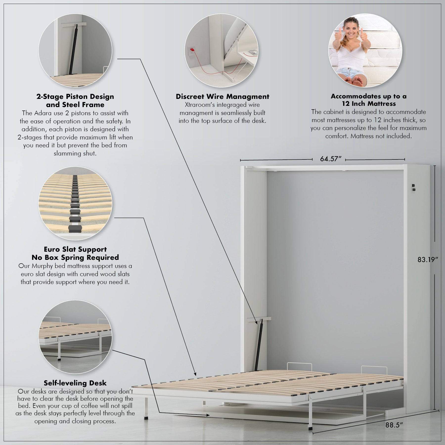 Building upon the sleek design of our Amara model, the Adara bed introduces the exceptional convenience of a self-leveling desk. This feature is a game-changer: you can keep all your items—even a full coffee cup—on the desk surface without having to remove anything when lowering the bed. Furthermore, the Adara includes integrated wire management, eliminating cable clutter for a clean look. The bed itself is finished in a brilliant high-gloss white, using our sturdy steel frame for secure wall attachment and smooth-operating pistons for effortless motion. It comfortably accommodates most queen mattresses up to 12 inches thick, and the integrated euro-slats ensure a superb night's sleep. Its open-top design maintains the spacious feel of a traditional bed.