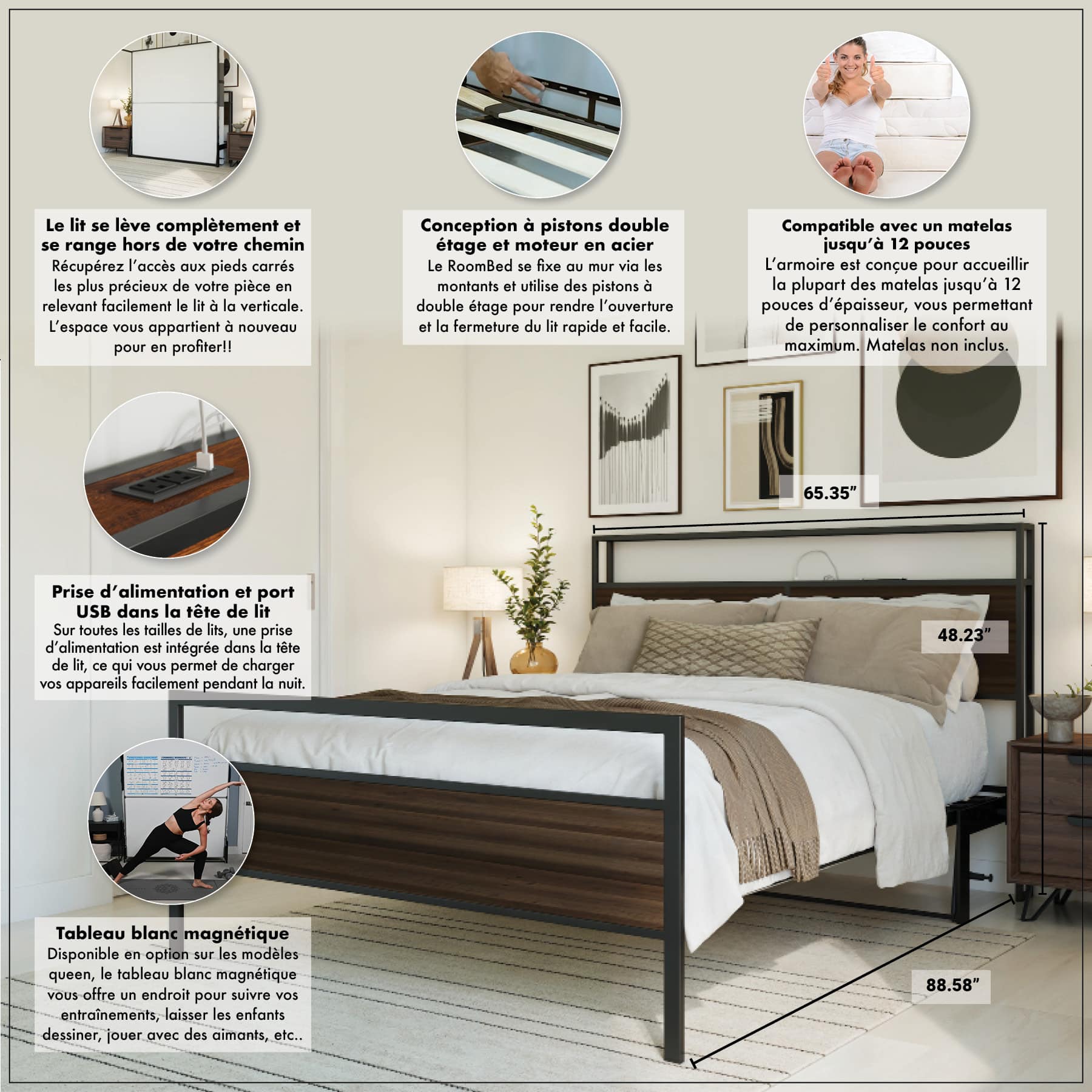 Grâce à son mécanisme à double piston en deux étapes, le RoomBed se soulève facilement et s'intègre facilement à votre espace pour une autre activité. Plus besoin de vous fatiguer !