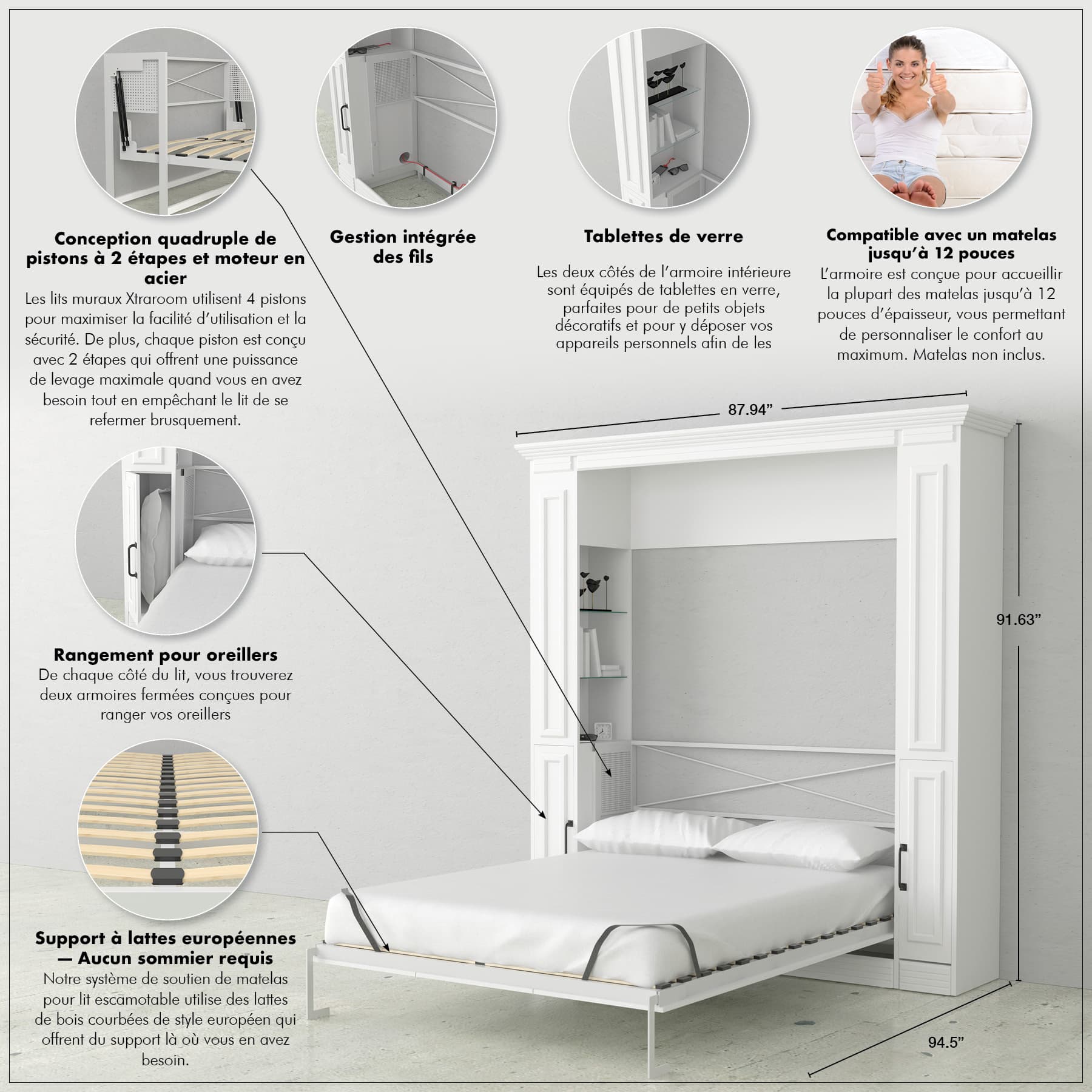 Convient à la plupart des matelas standard jusqu'à 12" d'épaisseur (literie retirée avant de fermer l'armoire)