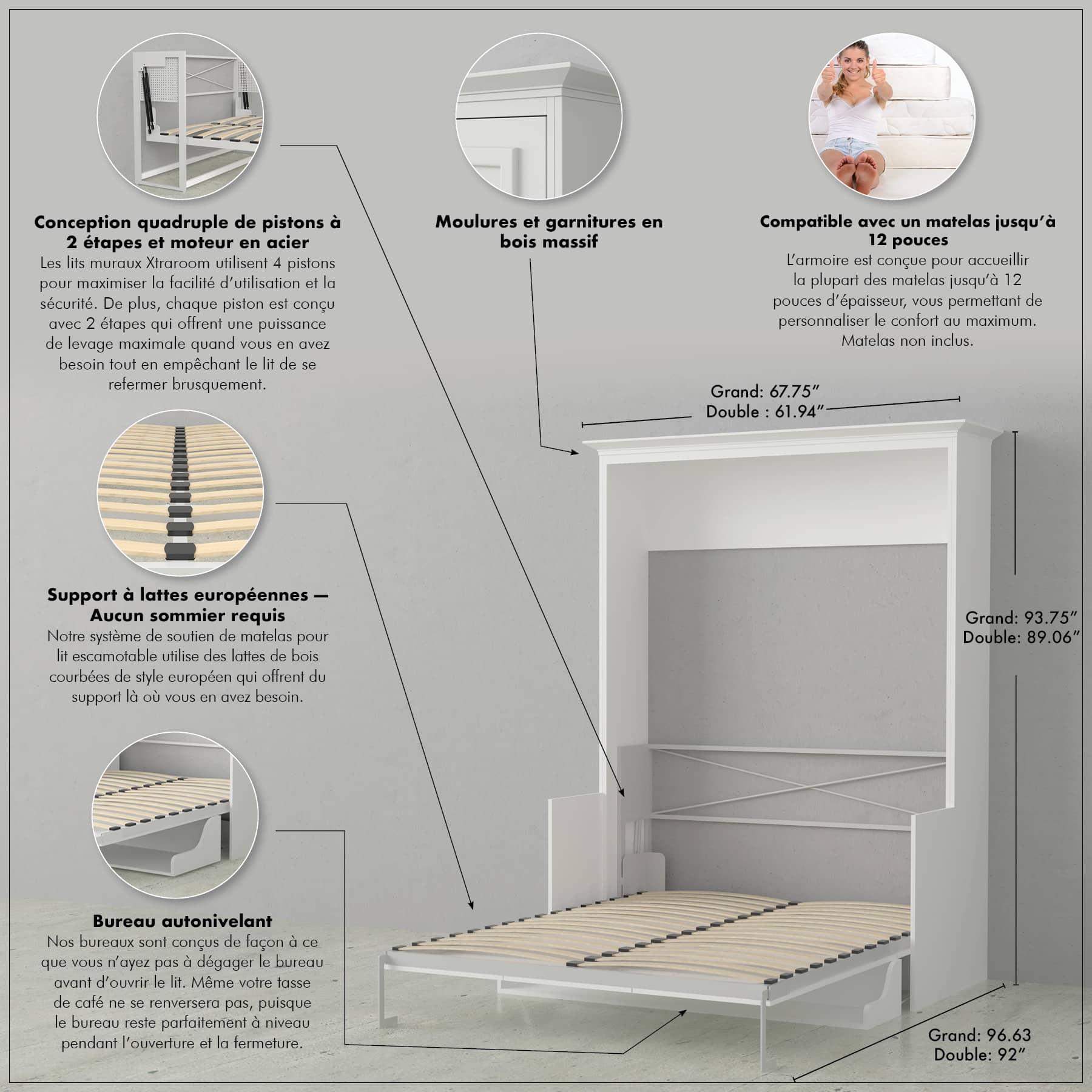 Convient à la plupart des matelas standard jusqu'à 12" d'épaisseur (literie retirée avant de fermer l'armoire)