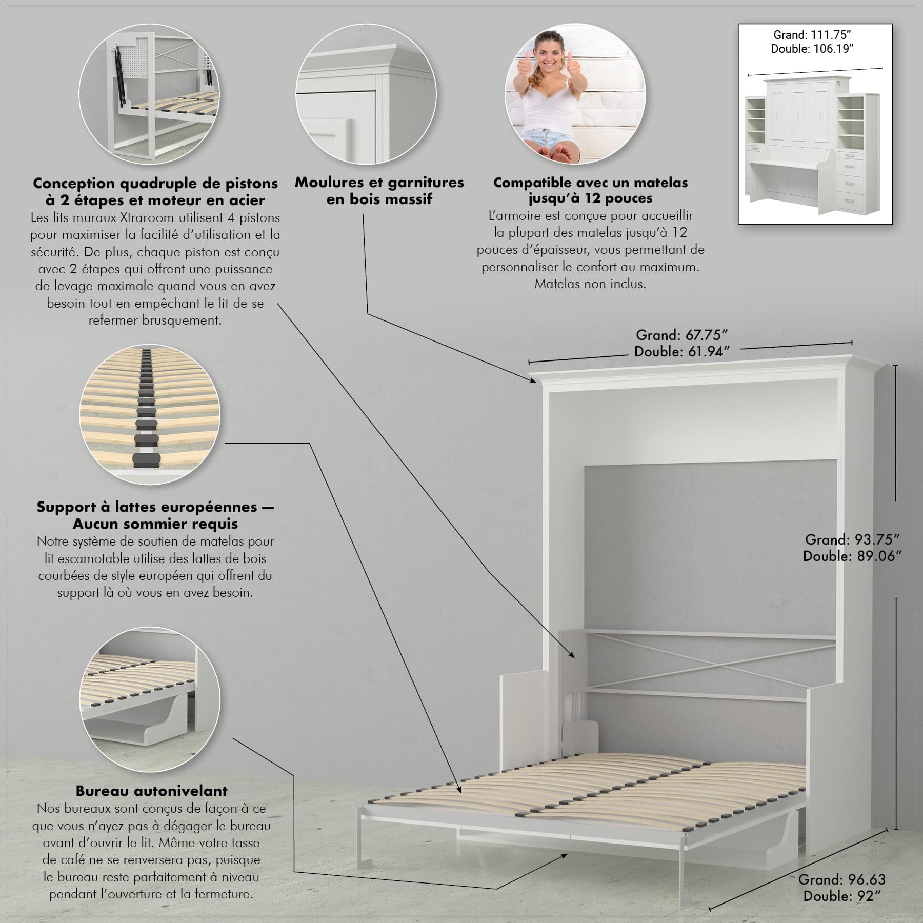 Convient à la plupart des matelas standard jusqu'à 12" d'épaisseur (literie retirée avant de fermer l'armoire)