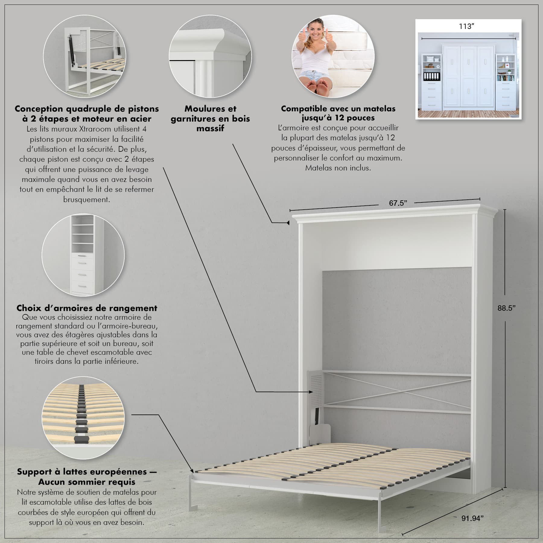 Convient à la plupart des matelas standard jusqu'à 12" d'épaisseur (literie retirée avant de fermer l'armoire)
