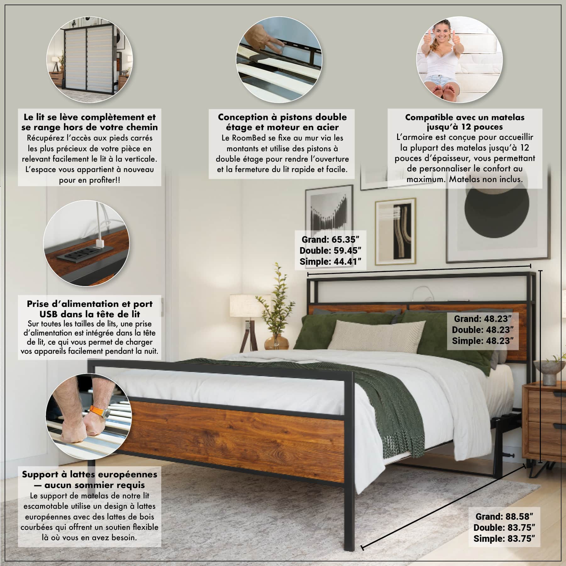 Grâce à son mécanisme à double piston en deux étapes, le RoomBed se soulève facilement et s'intègre facilement à votre espace pour une autre activité. Plus besoin de vous fatiguer !