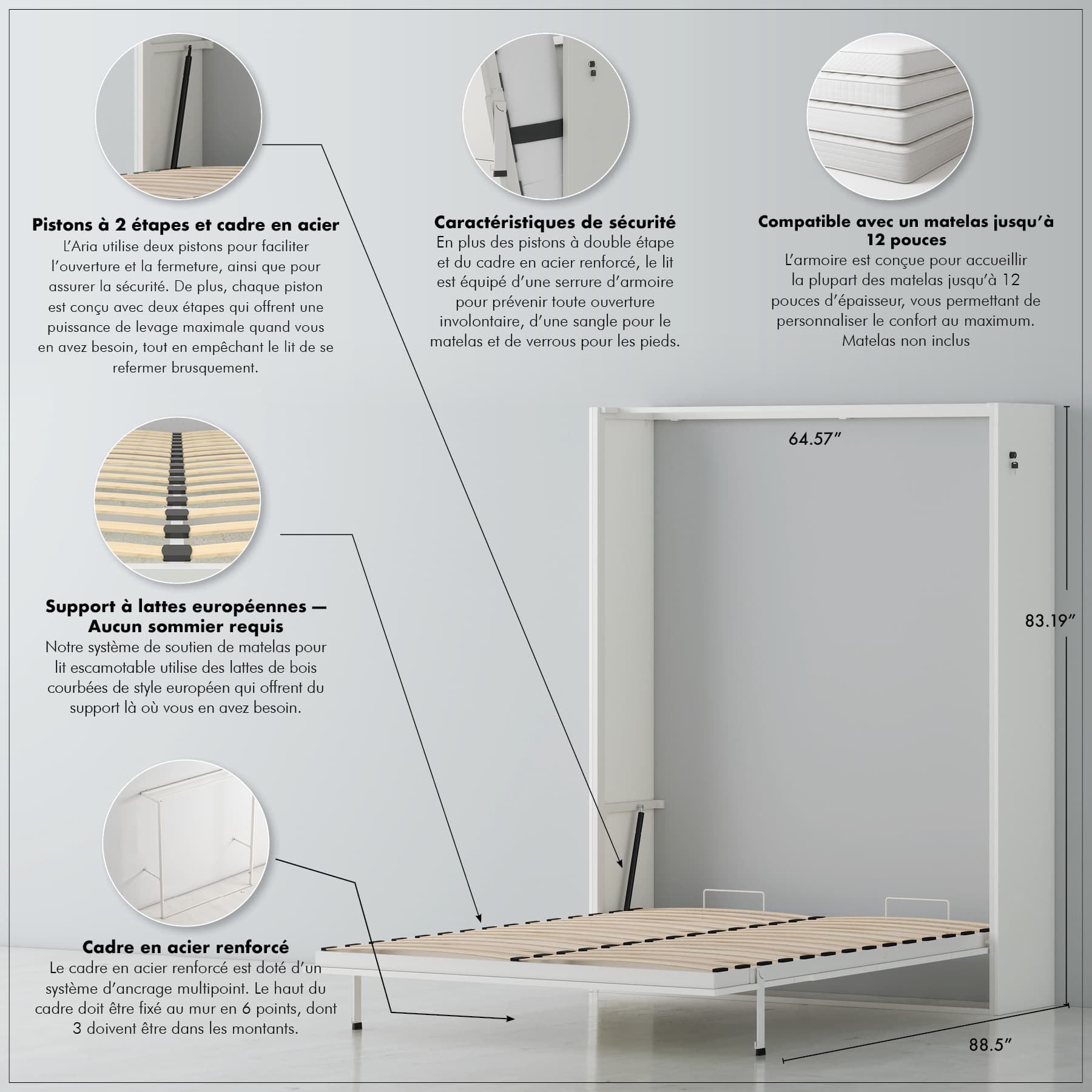 Convient à la plupart des matelas standard jusqu'à 12" d'épaisseur (literie retirée avant de fermer l'armoire)