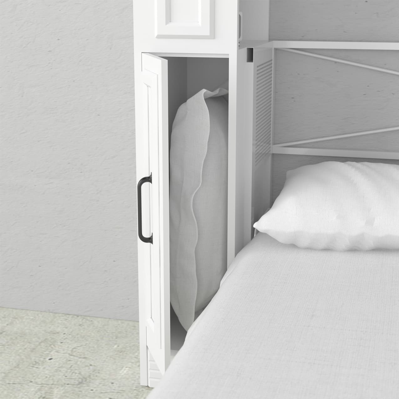 Xtraroom’s storage cabinets come with an array of customizable options. The top section can be set up with 3 adjustable shelves or a hanging bar for clothes. The bottom sections feature 3 pull-out drawers and a pullout nightstand. Many of our Murphy beds include one or two storage cabinets with the bed.