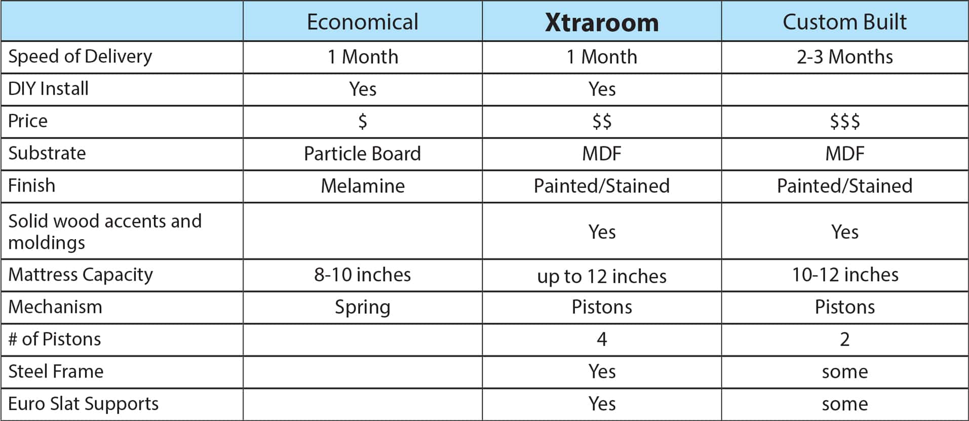 Murphy beds can range in price from $850 for a twin Murphy bed to $10,000+ for a custom-built wall bed. In general, most Murphy beds fall into one of two groups, the economical or the custom-built high-end groups. The pros of the economical group include the price is low, the delivery is fast, and the homeowner can install the bed. The cons are they are made with cheaper materials and offer fewer features. Custom-built Murphy beds offer endless features and high-quality materials, but they are extremely expensive and take months to be installed. Xtraroom’s Murphy beds fit right in the middle offering high-quality design and materials, and great features. They can be installed by the homeowner and come at a moderate price.