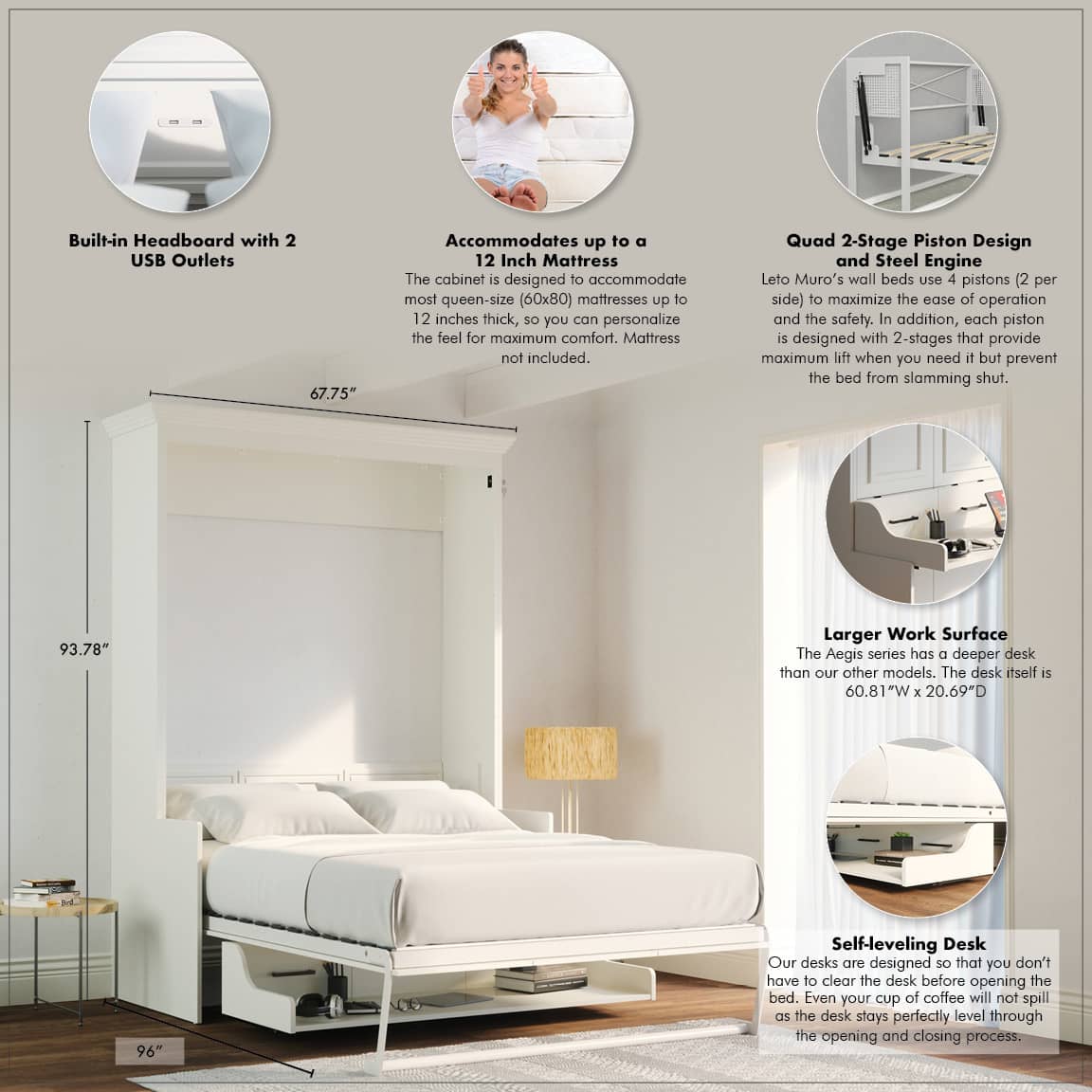 Meet the Aegis Queen Murphy Bed! Upgraded with a bigger desk, solid wood-accented headboard, and handy USB ports, it's the ultimate evolution of our Alegra series. The desk stays steady, making work-to-sleep transitions a breeze! With it's transitional design, easy assembly, comfy Euro slats—it's both style and comfort in one. Transform it effortlessly into stunning furniture when not in use!