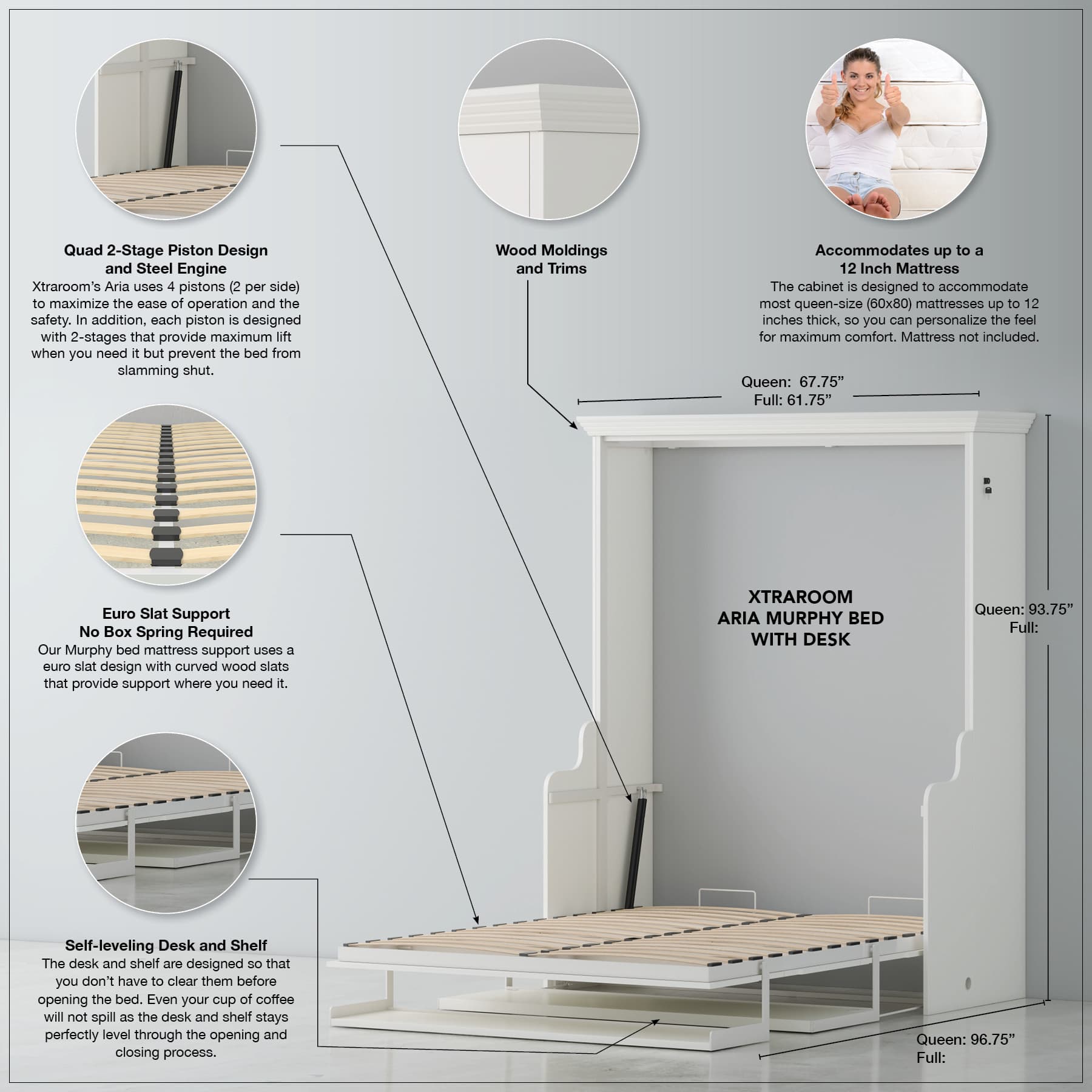 Accommodates most standard matresses up to 12" thick (bedding removed before closing the cabinet)