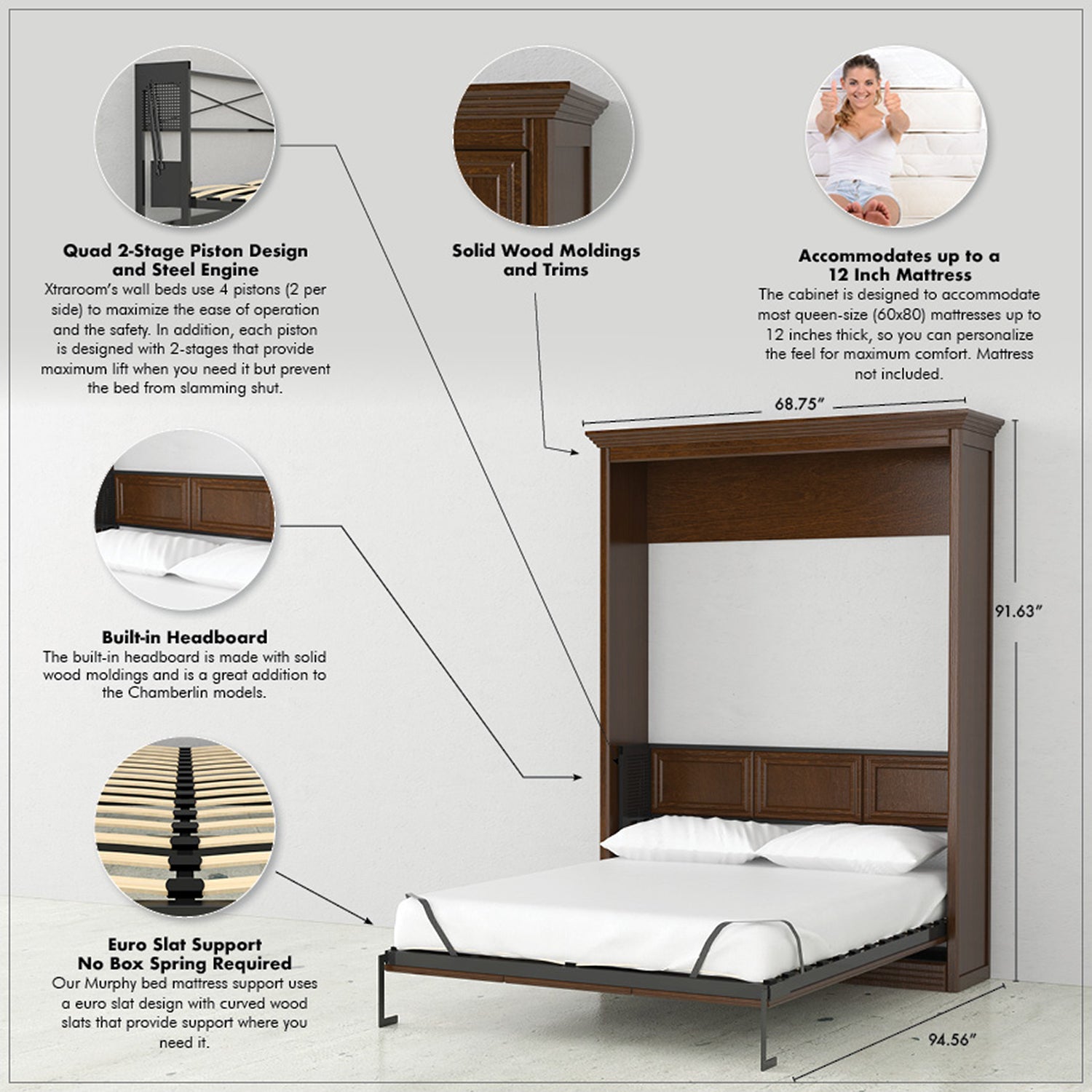 Accommodates most standard matresses up to 12" thick (bedding removed before closing the cabinet)