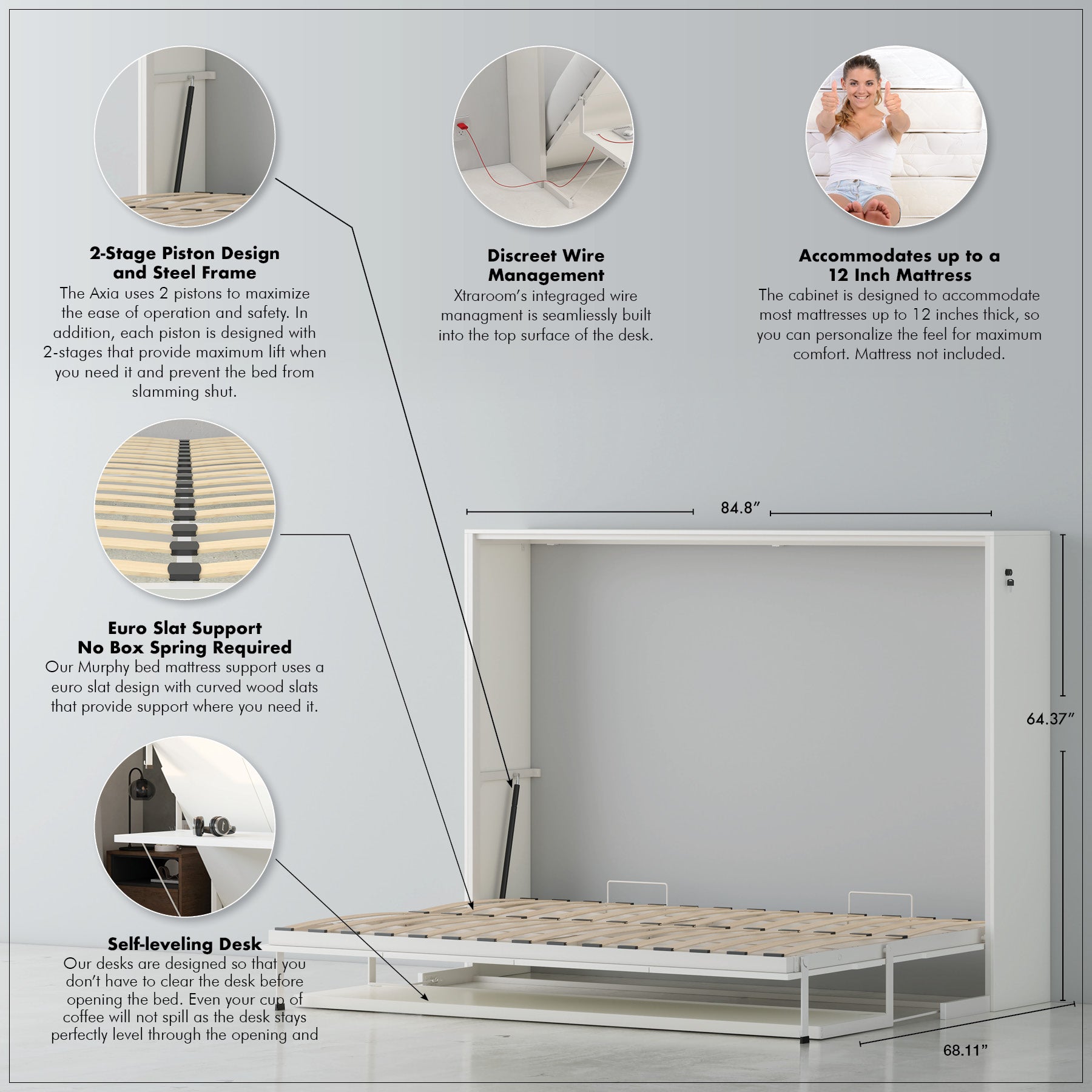 When a traditional vertical Murphy bed won't work, the Axia Horizontal Bed provides the perfect solution. Designed for rooms with lower ceilings or smaller footprints, this innovative model maintains full functionality while fitting into challenging spaces. It features a smart self-leveling desk with integrated wire management seamlessly built into the top surface. Finished in a striking high-gloss white, the bed utilizes our secure steel frame for wall attachment and smooth-operating pistons for effortless conversion. It accommodates most queen mattresses up to 12 inches thick, and its integrated euro-slats guarantee a supremely comfortable night's sleep. Perfect for home offices!